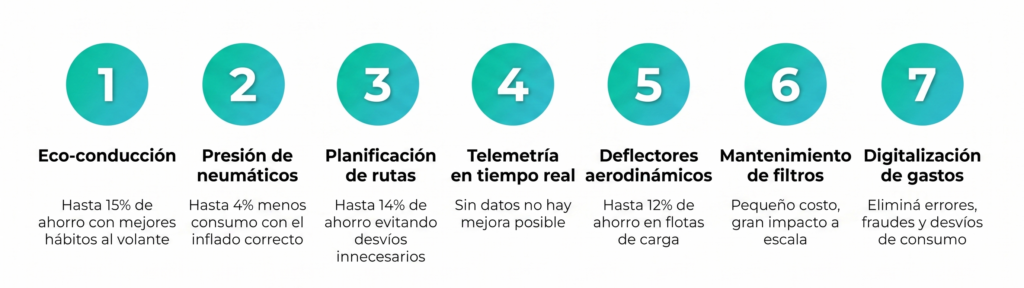 1. Capacitación en eco-conducción La eco-conducción, también llamada eco-driving, es el conjunto de hábitos al volante que reducen el consumo sin afectar los tiempos de viaje: arranques suaves, frenadas anticipadas y velocidad constante. Según el Programa de Transporte Inteligente del Ministerio de Economía de Argentina, una conducción eficiente puede reducir el consumo de combustible hasta un 15%.